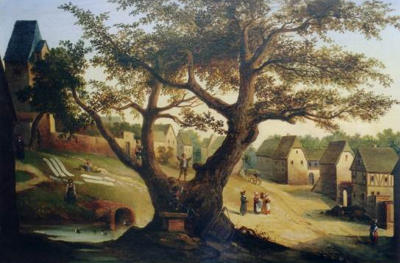 Ortsansicht mit Dorflinde und Taufgesellschaft (unbekannter Maler um 1850)